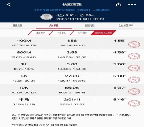 雖然比起訓(xùn)練營里的其他同學(xué)來說,我的數(shù)據(jù)還不夠漂亮,但相對我自己來說算是有很大的進(jìn)步了,關(guān)鍵是我找到了或者說是身體自身體會到了改進(jìn)的知覺和方法。步頻也從開始的費(fèi)力最高175,改進(jìn)到輕松穩(wěn)定186左右。這次濟(jì)南馬拉松比賽期間我實(shí)踐了一下,跑起來關(guān)注維持關(guān)鍵跑姿同時(shí)維持高步頻,在兩三個(gè)月實(shí)際體能并沒有提高多少、賽道難度對我來說很困難且一點(diǎn)沒有經(jīng)驗(yàn)的情況下依然跑出了自己的最好成績,過程中的各段配速也都PB了,這是我賽前沒有想到的,算是改進(jìn)跑姿后的驚喜。心肺功能、力量方面我訓(xùn)練量還不足、髖關(guān)節(jié)靈活度不夠也影響步幅,有氧跑量和力量訓(xùn)練是繞不過去的,這是我今后要改進(jìn)的重點(diǎn)。
