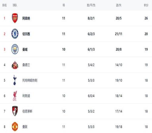 在積分榜上,阿森納依然占據(jù)榜首位置,拿到了26分。切爾西贏球之后,暫時升到了第2的位置,拿到20分,與阿森納有6分的差距。曼城19分排名第3。不過,曼城少踢1場。桑德蘭這匹黑馬也是19分,排名第4。熱刺、利物浦、伯恩茅斯和曼聯(lián)這4支球隊都是18分,排名第5到第8。水晶宮以16分排名第9。