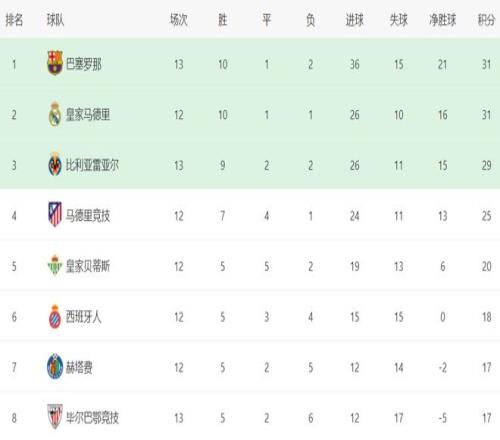在積分榜上,巴薩暫時超越皇馬登頂。巴薩10勝1平2負(fù),拿到31分?;蜀R也是31分,但是凈勝球比巴薩少,只能排名第2。不過,皇馬比巴薩少踢1場,接下來有機(jī)會重新登頂。比利亞雷亞爾以29分排名第3,與巴薩皇馬的差距很小。馬競以25分排名第4。第5的是皇家貝蒂斯,拿到了20分。西班牙人以18分排名第6。赫塔費(fèi)和畢爾巴鄂競技都是17分。塞維利亞和皇家社會只拿到16分。