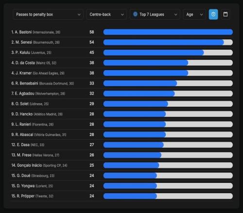 從統(tǒng)計(jì)數(shù)據(jù)可以看到, 本賽季歐洲七大聯(lián)賽里,中衛(wèi)球員向禁區(qū)傳球次數(shù)榜單上塞內(nèi)西僅次于巴斯托尼,排在所有同行里的第2名。