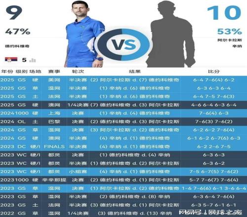 如果德約想奪冠,那么對陣阿卡和辛納兩人是無論如何繞不過去的。那么,在歷史上與兩人的硬地交鋒中,德約的戰(zhàn)績?nèi)绾文兀?/p>